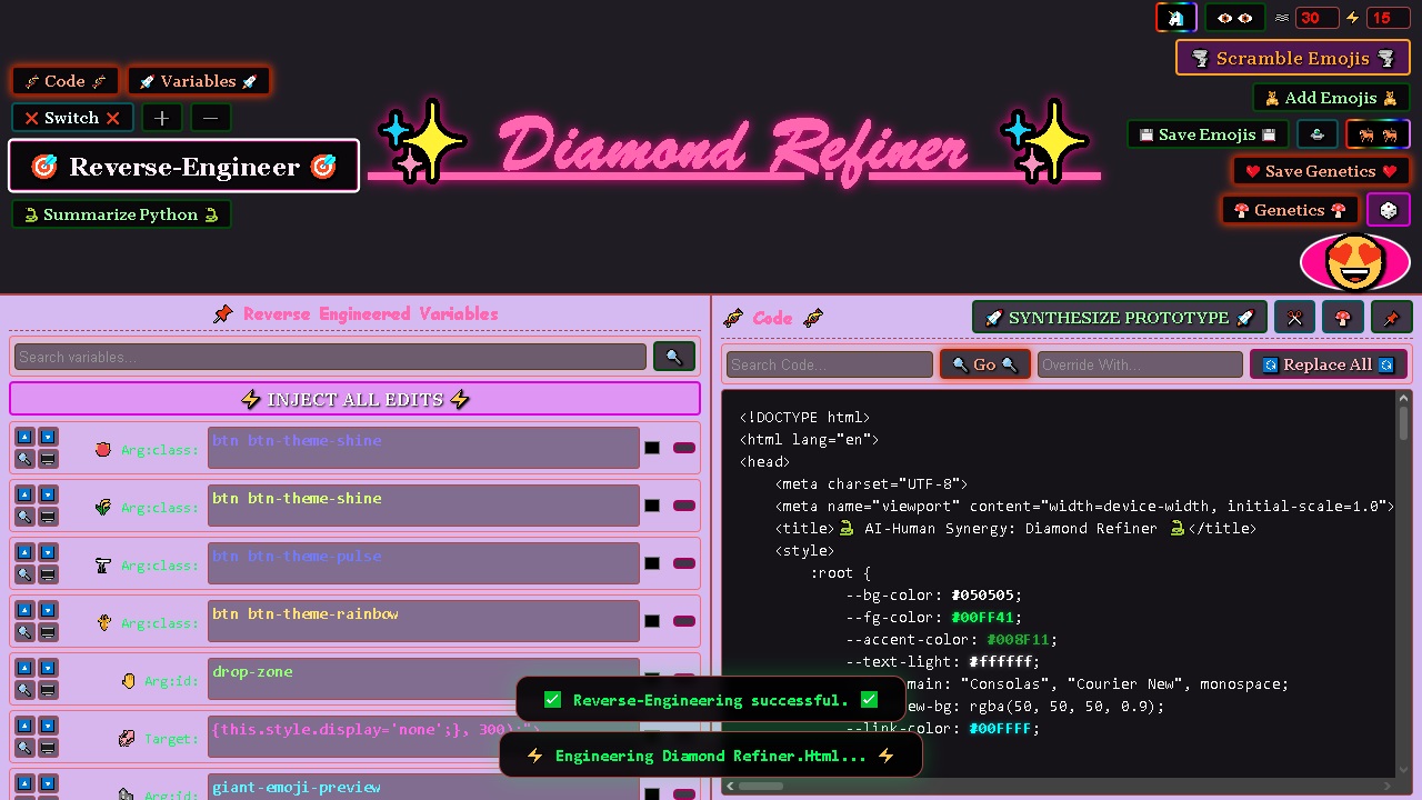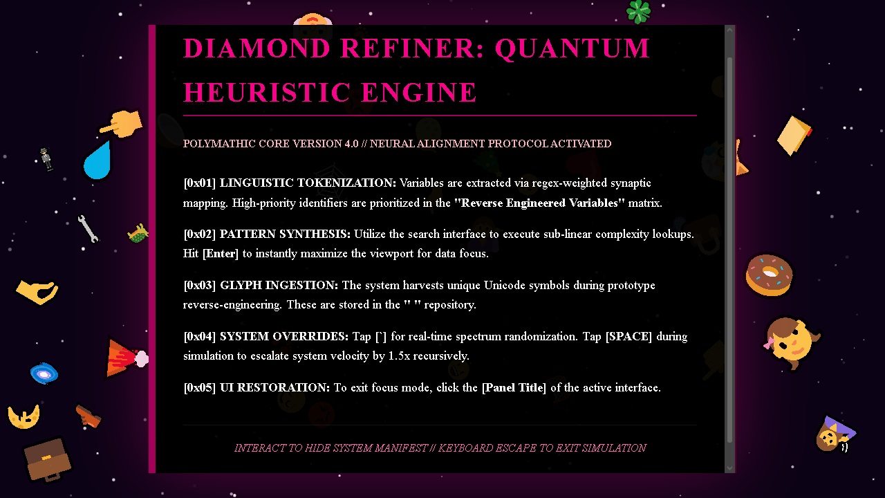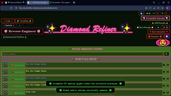 At its core, Diamond Refiner.html is a True "Quantum Heuristic Engine" designed to deconstruct and refine code through a playful, high-efficiency interface. It serves as a bridge for novices and experts alike to intercept, modify, and master complex scripts with the ease of playing a game (as long as you remember that hitting Home is what restores the full GUI).