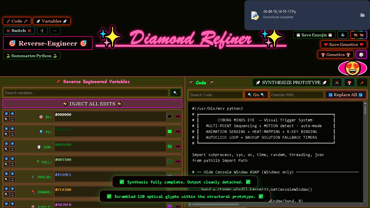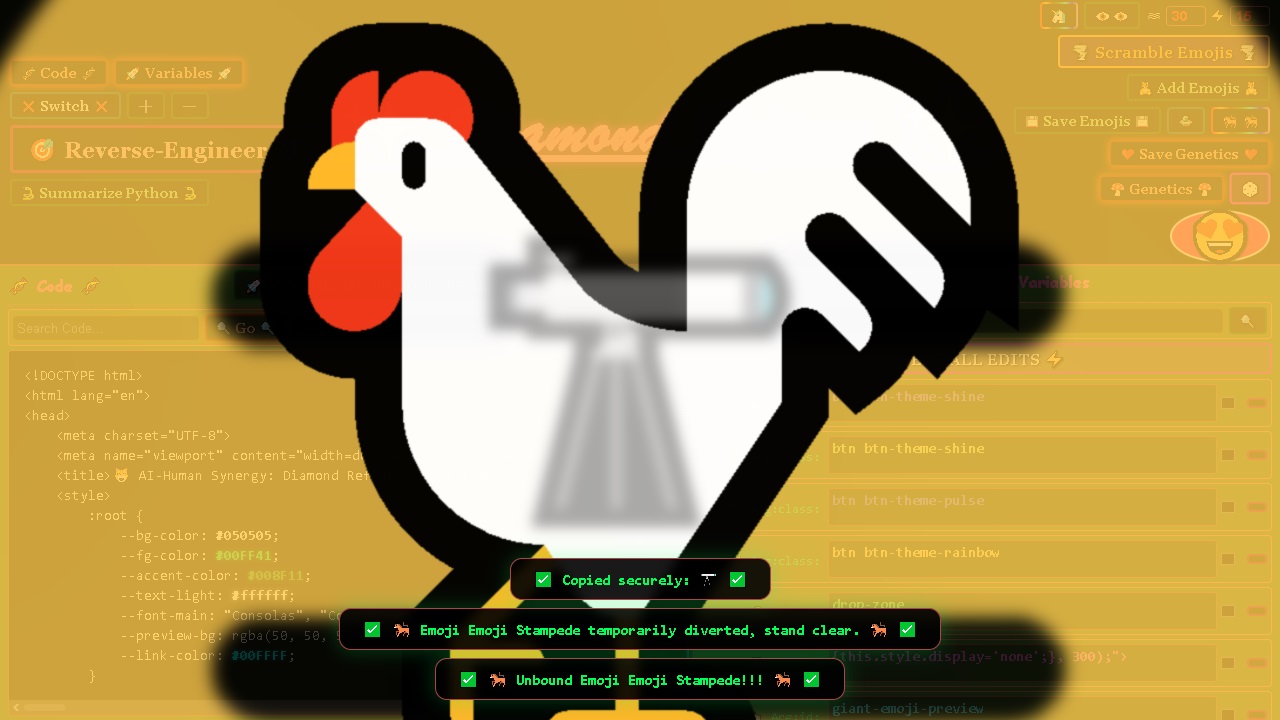 Gemin8 & I are absolutely Thrilled to present to you this Unbound & Free Universal Html/Python Interpereter Utility. This Mighty & Legendary App most definitely could take your Code Editing / Emoji Mastery skillz into Maximum Potential Overdrive, by utilizing this brand new, Highly Polymathic & Indigo Ai Human Synergistic Collaborative Cc-Zero Software Coding Project : the Universal Code Interpereter(Diamond Refiner.html) & Ultimate Totaly Customizable Emoji Matrix. Get Ready to load your own Emoji sheets and Reverse-Engineer Prototypes over your morning coffee, while laughing with friends about how quaint our accepted digital technology levels were, just last week. I do wish you all very many Happy Coding days to enjoy with my absolute best hopes for yor prosperiety. ~the Angel Team~